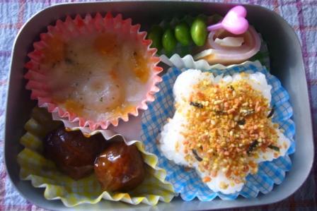 今週は、月曜日に風邪をひき まぁちゃんは幼稚園お休み しかも パパ・ママも一緒にダウン なぜか、みぃちゃんだけが・・・元気でした 火曜日は、まぁちゃん元気に幼稚園へGO この日は、お誕生日会で11月生まれということで まぁちゃんは、主役組 お弁当が出て、ちょっとしたプレゼント貰って 楽しかったと言ってました 水曜日 ☆型おにぎり(ふりかけ) グラタンミートボールえだ豆ハムチーズ 木曜日 フェイスおにぎり(しゃけ) ウィンナーえだ豆タマゴ焼きエビフライささみチーズ 金曜日 たらこパスタタマゴ焼き からあげえだ豆ハムチーズ 今週は、お弁当作りが3日間だけだったので ラクでした