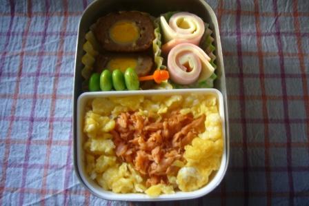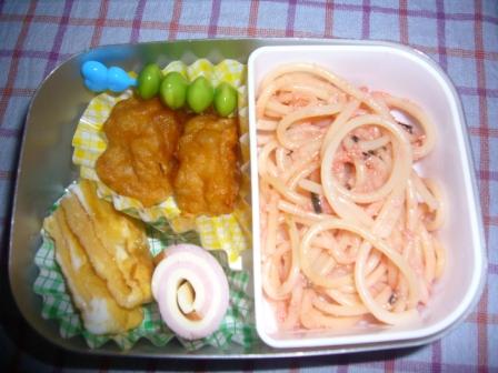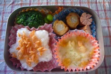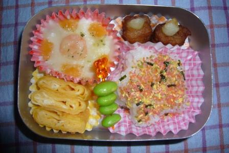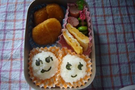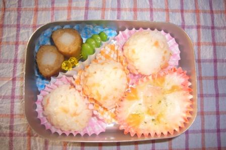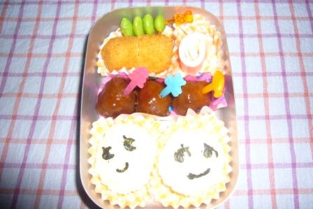 今週は、月曜日に風邪をひき まぁちゃんは幼稚園お休み しかも パパ・ママも一緒にダウン なぜか、みぃちゃんだけが・・・元気でした 火曜日は、まぁちゃん元気に幼稚園へGO この日は、お誕生日会で11月生まれということで まぁちゃんは、主役組 お弁当が出て、ちょっとしたプレゼント貰って 楽しかったと言ってました 水曜日 ☆型おにぎり(ふりかけ) グラタンミートボールえだ豆ハムチーズ 木曜日 フェイスおにぎり(しゃけ) ウィンナーえだ豆タマゴ焼きエビフライささみチーズ 金曜日 たらこパスタタマゴ焼き からあげえだ豆ハムチーズ 今週は、お弁当作りが3日間だけだったので ラクでした
